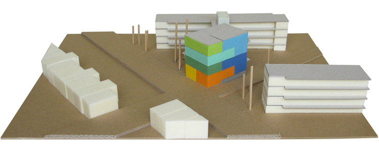 1st prize in the competition Ungewöhnlich Wohnen, organized by the Bremen housing association GEWOBA for five sites. Modernization and expansion of a 1950s public housing project, providing a wider range of unit sizes and plan types, and improved links to the neighborhood. The new buildings are linked to the existing slab blocks by walkways, providing step-free access to all units. New units have a semi-independent Optionsraum, which can be used as a home-office, or a bedroom for an older child or guest.